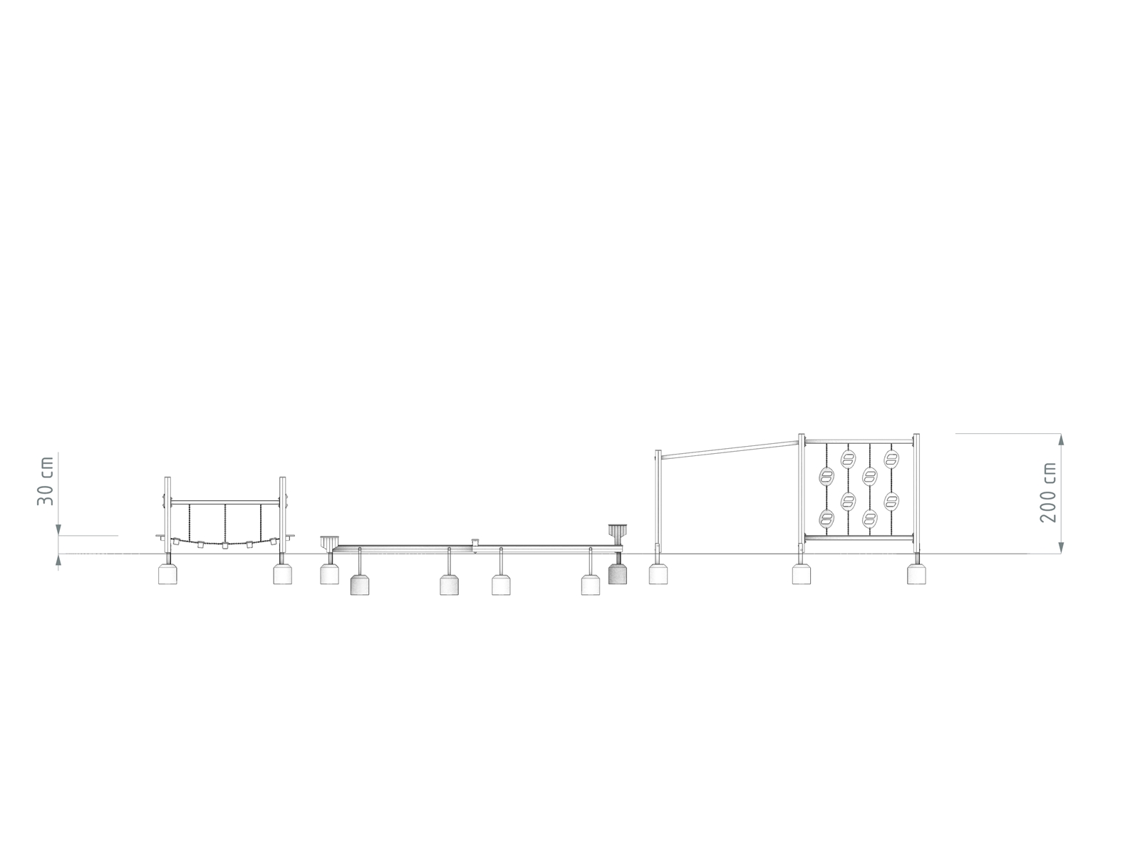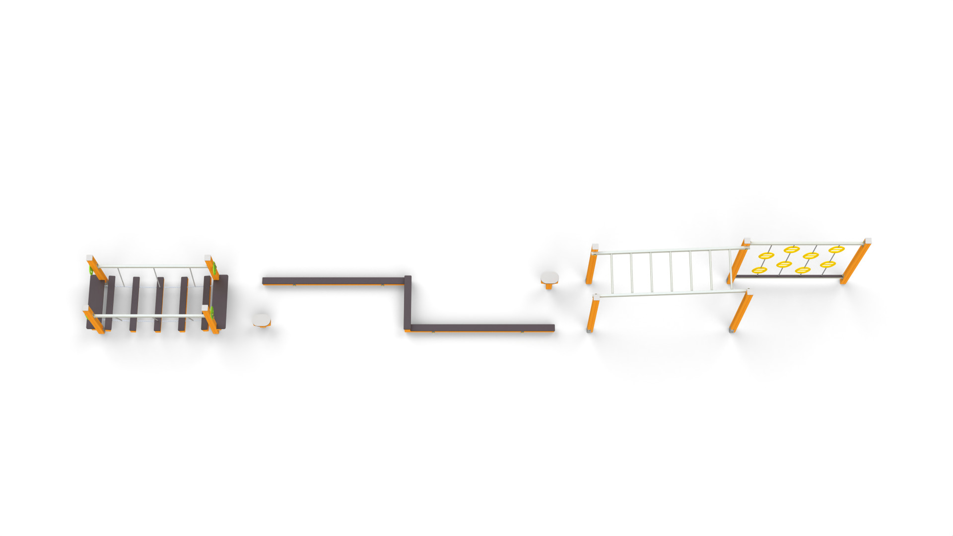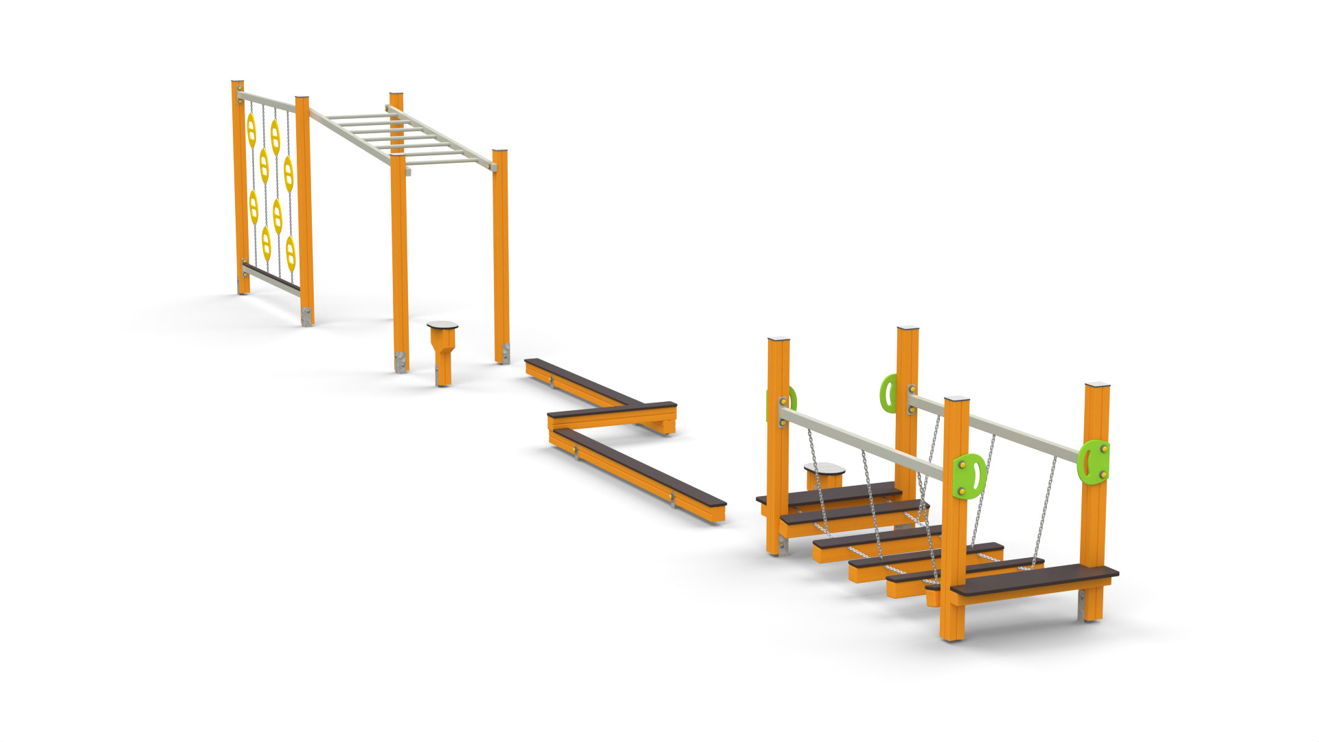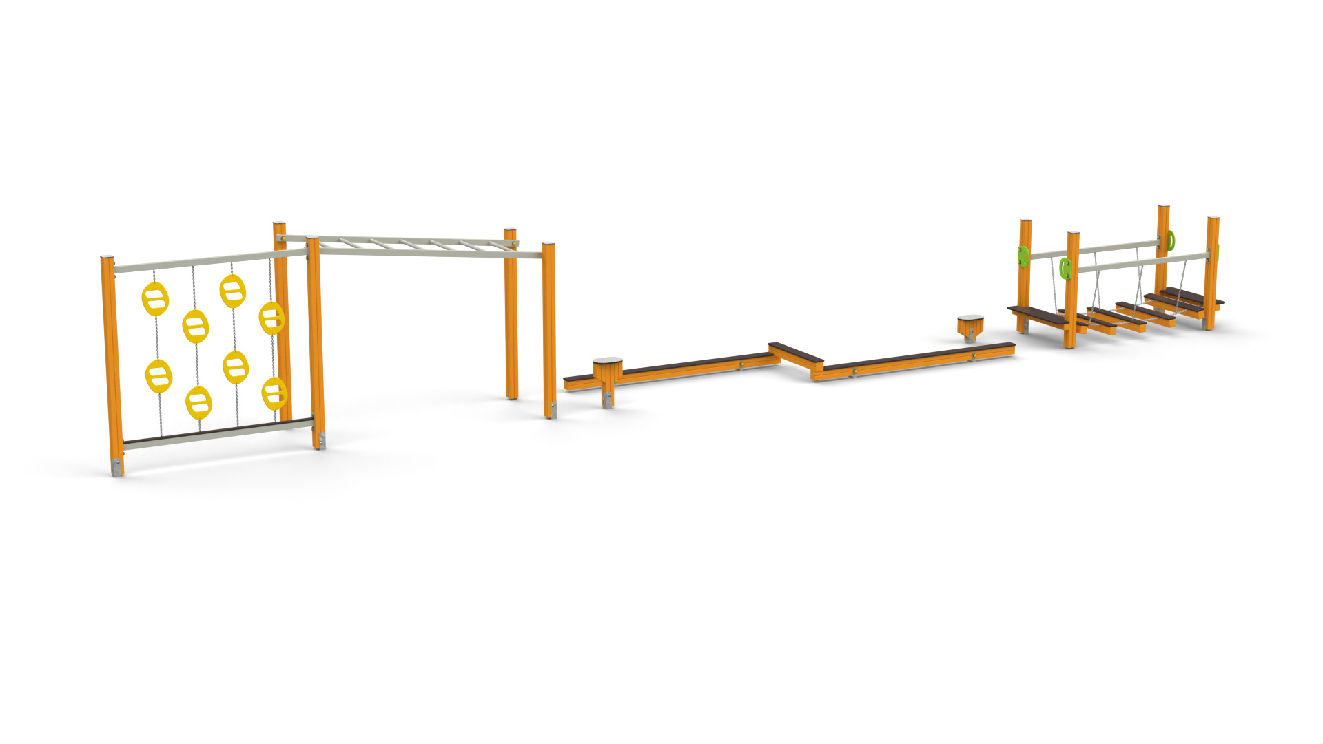 Urozmaicona trasa łącząca równoważnie, przeszkody niskie, elementy wspinaczkowe i slalom. Sprawdza się do zabaw grupowych, zajęć ruchowych i codziennej aktywności.