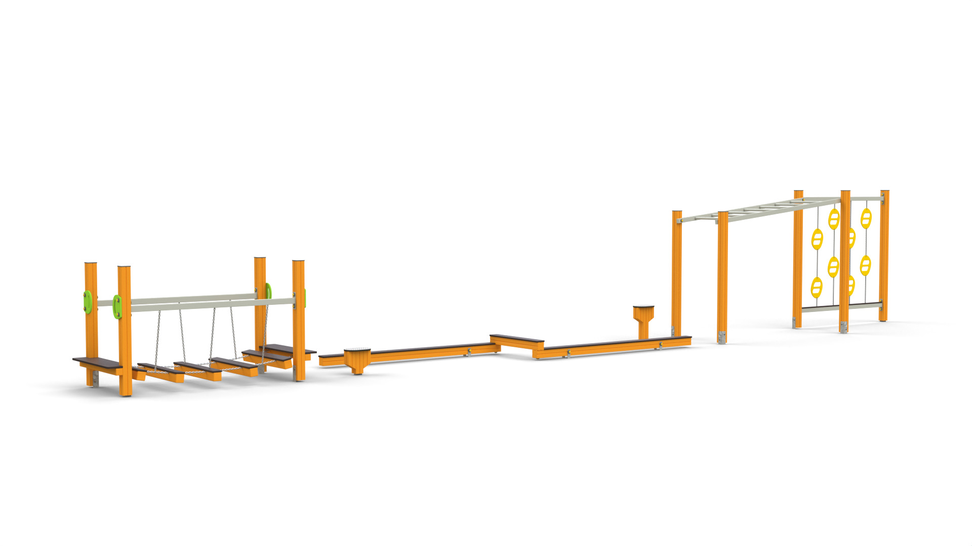 Idealna do niewielkich przestrzeni: kilka elementów balansowych i przejść, które angażują całe ciało, ale nie wymagają dużej powierzchni. Dobra opcja na osiedla lub mniejsze przedszkola.