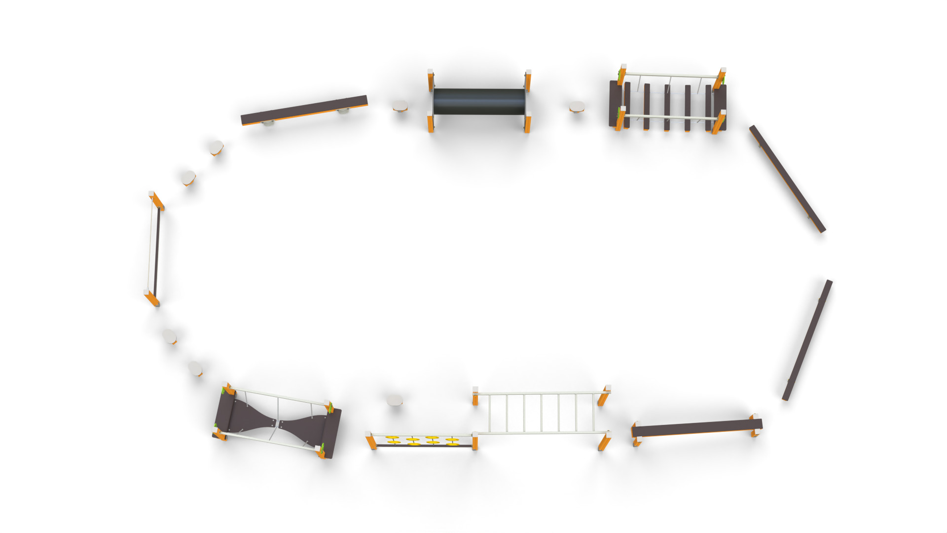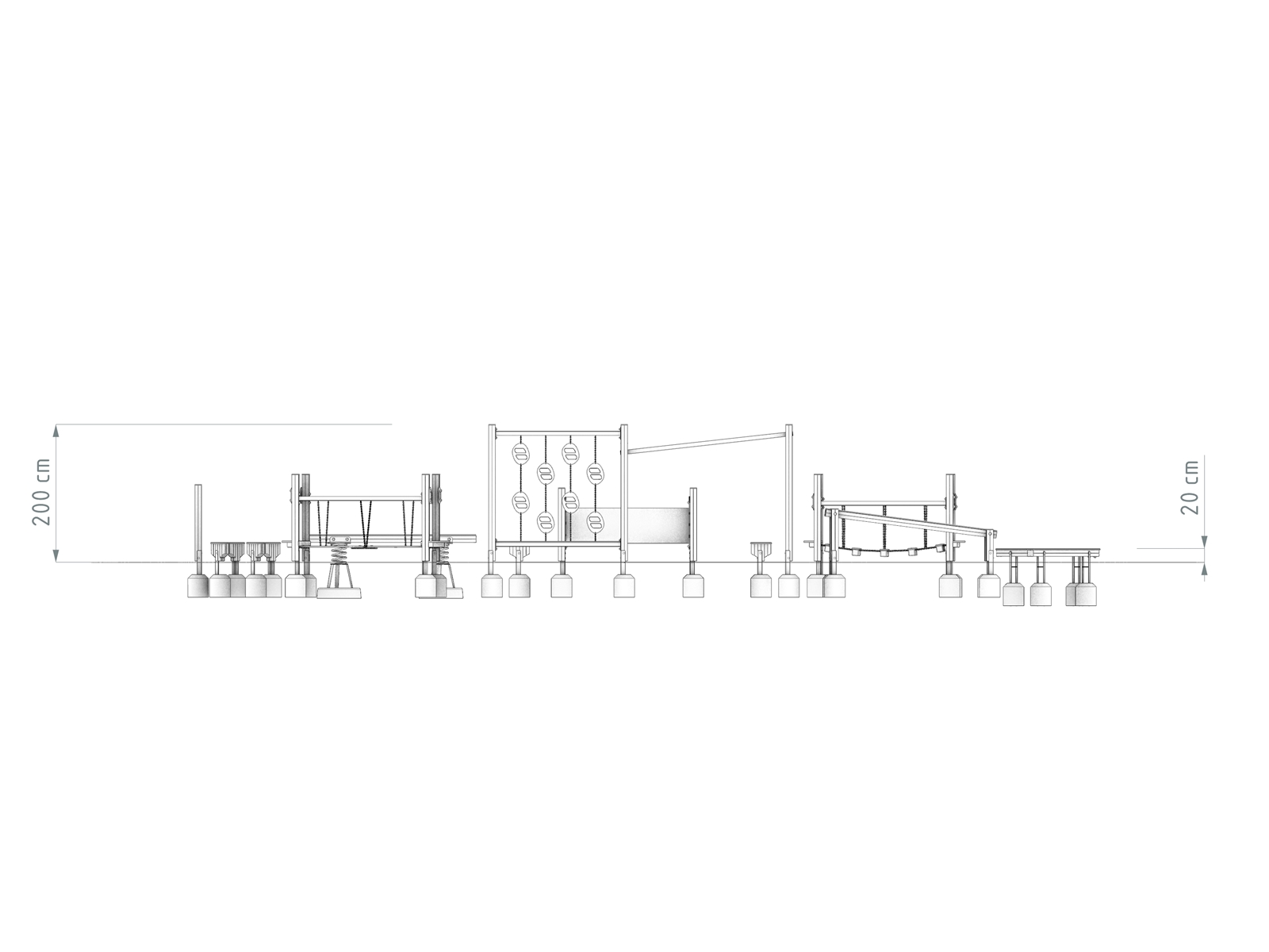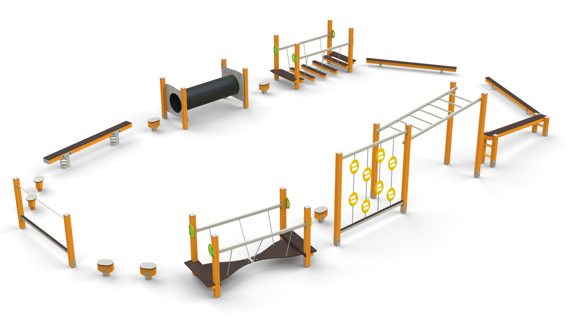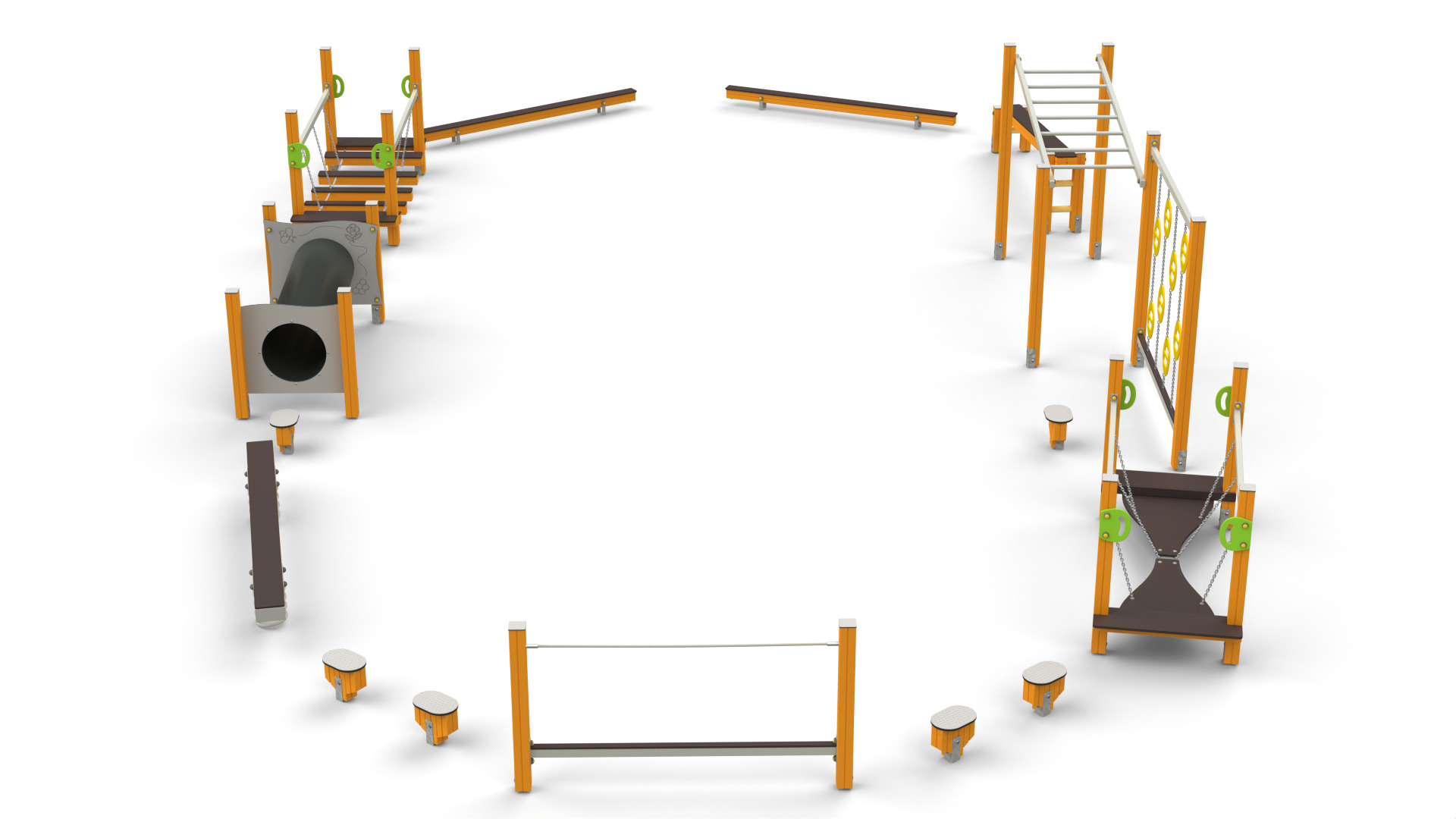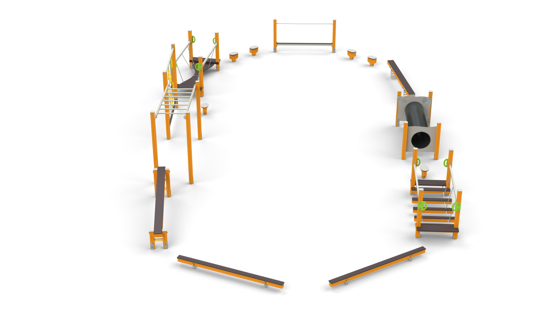 Urozmaicona trasa łącząca równoważnie, przeszkody niskie, elementy wspinaczkowe i slalom. Sprawdza się do zabaw grupowych, zajęć ruchowych i codziennej aktywności.
